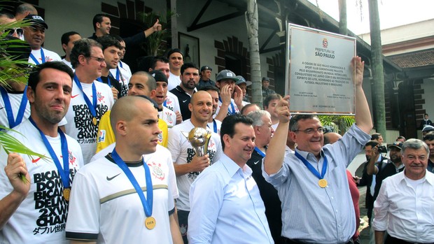 O objeto exalta o segundo título mundial conquistado pelo clube (o primeiro havia sido em 2000, sobre o Vasco) e o “reconhecido espírito de luta” apresentado pela equipe em terras japonesas. Logo após a entrega da placa, os corintianos cumprimentaram o prefeito e subiram no trio elétrico, de onde continuam a festa pelas ruas de São Paulo. Veja o texto escrito na placa confeccionada pela Prefeitura de São Paulo: