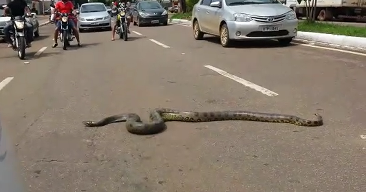 Uma sucuri foi flagrada atravessando a Avenida Rio Madeira, próximo ao shopping de Porto Velho. As imagens mostram os veículos parando para a cobra atravessar a pista. Assista: