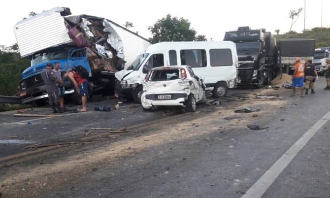 Um grave acidente foi registrado na tarde deste sábado (28), na rodovia BR-242, localidade conhecida como Zuca do Amparo, distrito no município de Boa Vista do Tupim, centro-oeste baiano. Um engavetamento envolvendo caminhão, van e 3 carretas, teria provocado duas mortes e várias pessoas feridas. Uma das vítimas foi projetada para fora do veículo, morrendo no local. Outra morreu presa às ferragens. Ainda não foi esclarecido o que motivou o acidente.