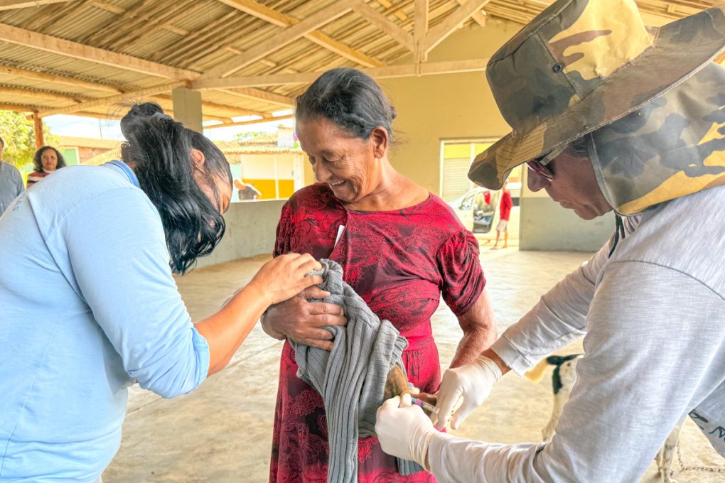Nesta terça-feira (5), o distrito de Veredinha recebeu a visita da equipe de vacinadores. Marluci Nascimento Oliveira levou seus dois cachorros, Amora e Chico, para vacinar. “Essa vacina é muito importante, principalmente porque eles são bravos. Então, é uma proteção para eles e para nós”, explicou Marluci.