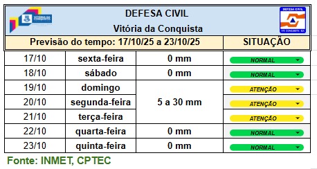 O Instituto Nacional de Meteorologia (Inmet) divulgou, nesta quinta-feira (16), a previsão de chuvas para os próximos dias. Segundo o informe, a cidade de Vitória da Conquista estará com alerta amarelo de chuvas entre o domingo (19) e terça-feira (21). A previsão é de chuvas entre 05 e 30 mm para os três dias.