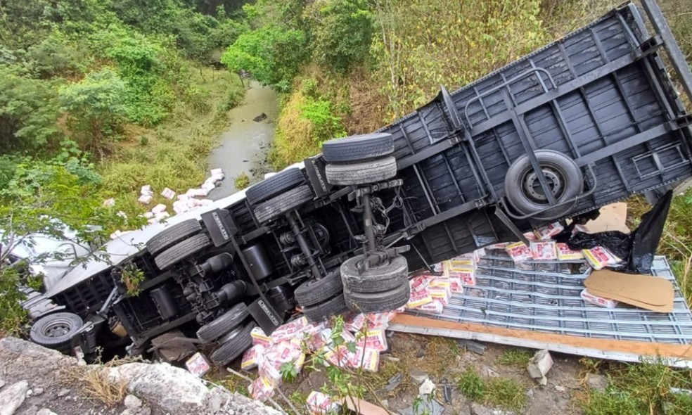 Um acidente envolvendo um caminhão carregado de fraldas gerou transtornos no trânsito da BR-116 na manhã desta terça-feira (21), no trecho que passa pelo município de Antônio Cardoso, a cerca de 33 km de Feira de Santana. O veículo tombou ao cair parcialmente de uma ponte no km 443 da rodovia por volta das 8h30, segundo informações da Polícia Rodoviária Federal (PRF).