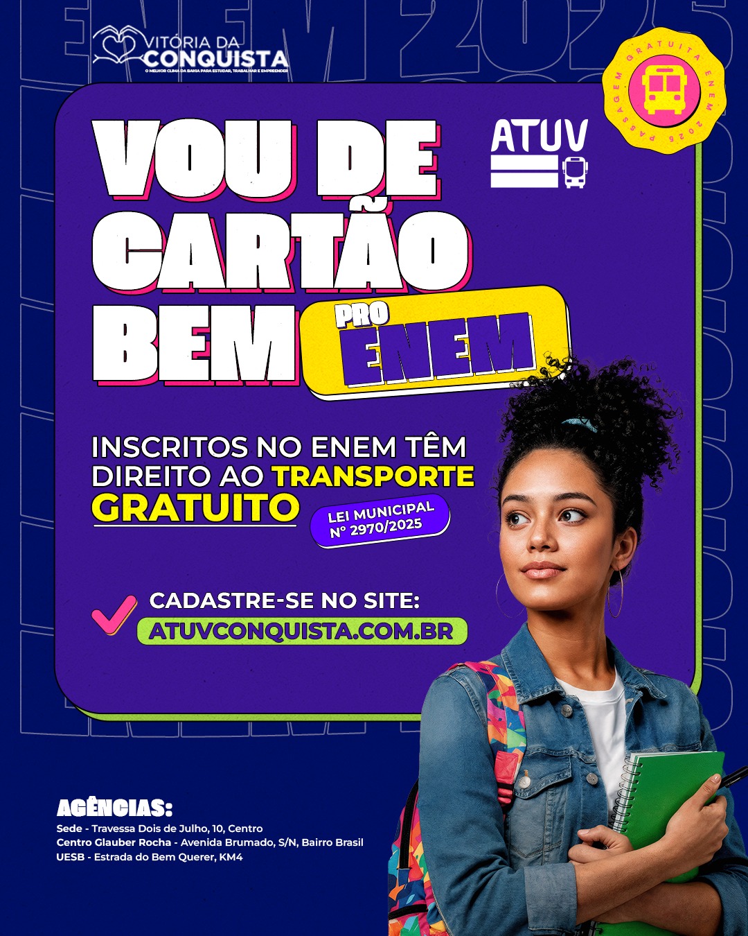 Com a proximidade do Exame Nacional do Ensino Médio (Enem) 2025, nos dias 9 e 16 de novembro, a Secretaria Municipal de Mobilidade Urbana (Semob) liberou o cadastro para que os estudantes garantam o acesso ao benefício da gratuidade no dia das provas, instituído pela Prefeitura Municipal de Vitória da Conquista em 14 de fevereiro deste ano, por meio da Lei Municipal 2970.