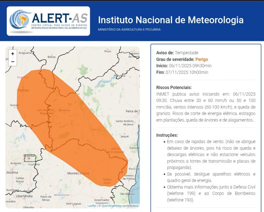 O aviso, válido até as 10h da manhã de sexta-feira (07), detalha o potencial destrutivo do fenômeno. São esperadas chuvas torrenciais, com volume estimado entre 30 e 60 milímetros por hora — um volume capaz de causar inundações rápidas. O maior perigo, no entanto, pode vir do céu. Estão previstas rajadas de vento “intensas”, que podem variar de 60 km/h a preocupantes 100 km/h.