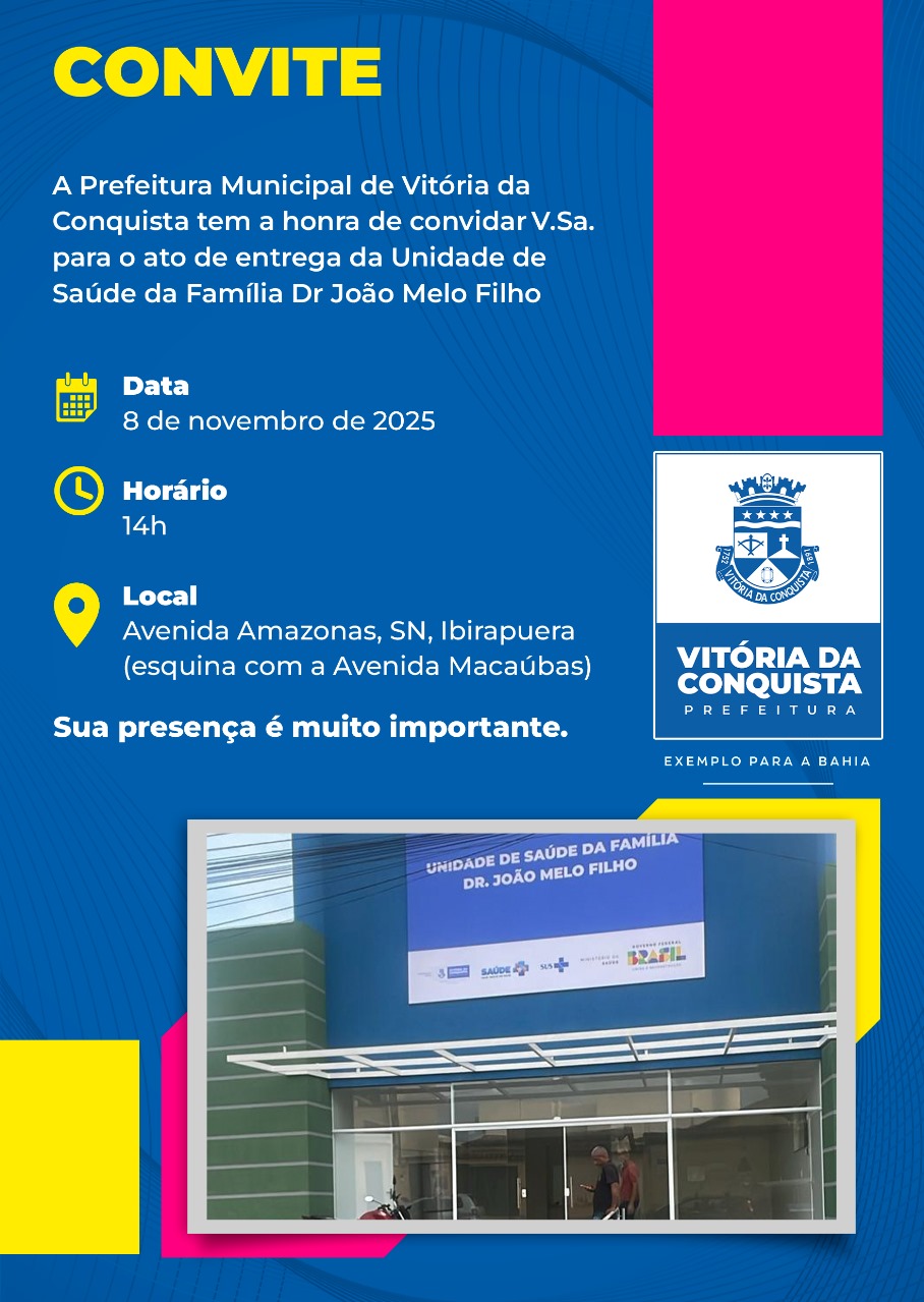A comunidade do bairro Ibirapuera e adjacências, na zona oeste de Vitória da Conquista, tem motivo para celebrar: a entrega da sede própria da Unidade de Saúde da Família (USF) Dr. João Melo Filho. O evento de inauguração será neste sábado (8), às 14h, e contará com a presença de autoridades locais.