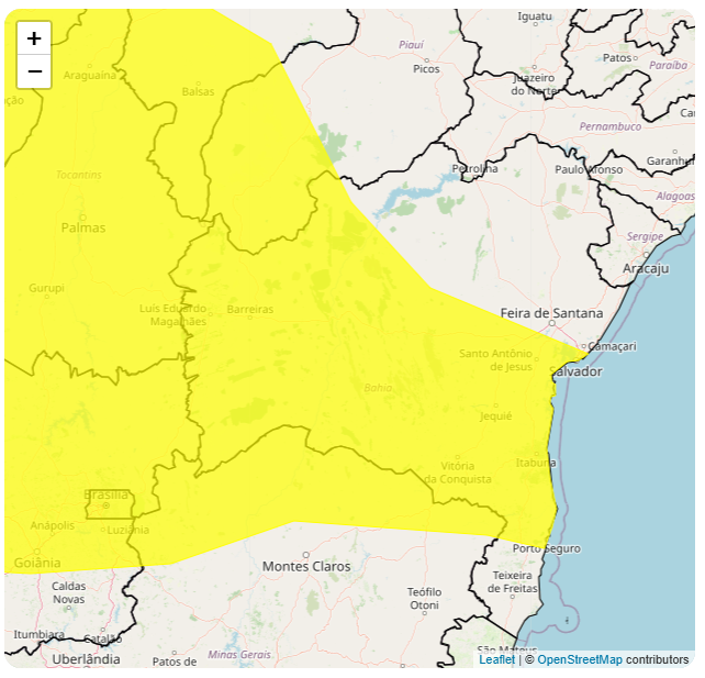 Um novo aviso foi emitido na manhã desta segunda-feira (10) pelo Instituto Nacional de Meteorologia (Inmet), com previsão de chuvas intensas para Vitória da Conquista e outros municípios da Bahia. Segundo o instituto, o grau de severidade do alerta amarelo é de perigo potencial, podendo chover entre 20 e 30 mm/h ou até 50 mm/dia, e ventos intensos (40-60 km/h).